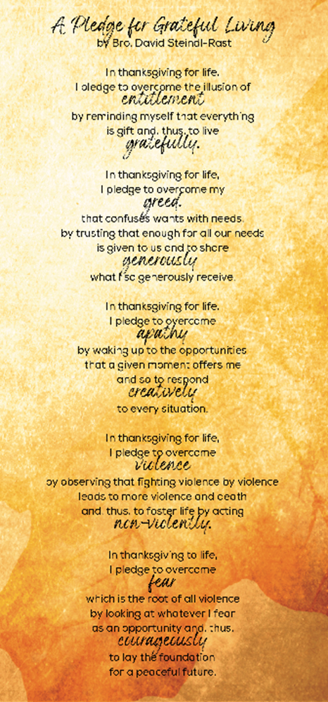Bro. David Steindl-Rast also penned “A Pledge for Grateful Living.” I close with an invitation for you to join me in reading it together, and if you are so inclined, even adopting it as a personal rule of life: